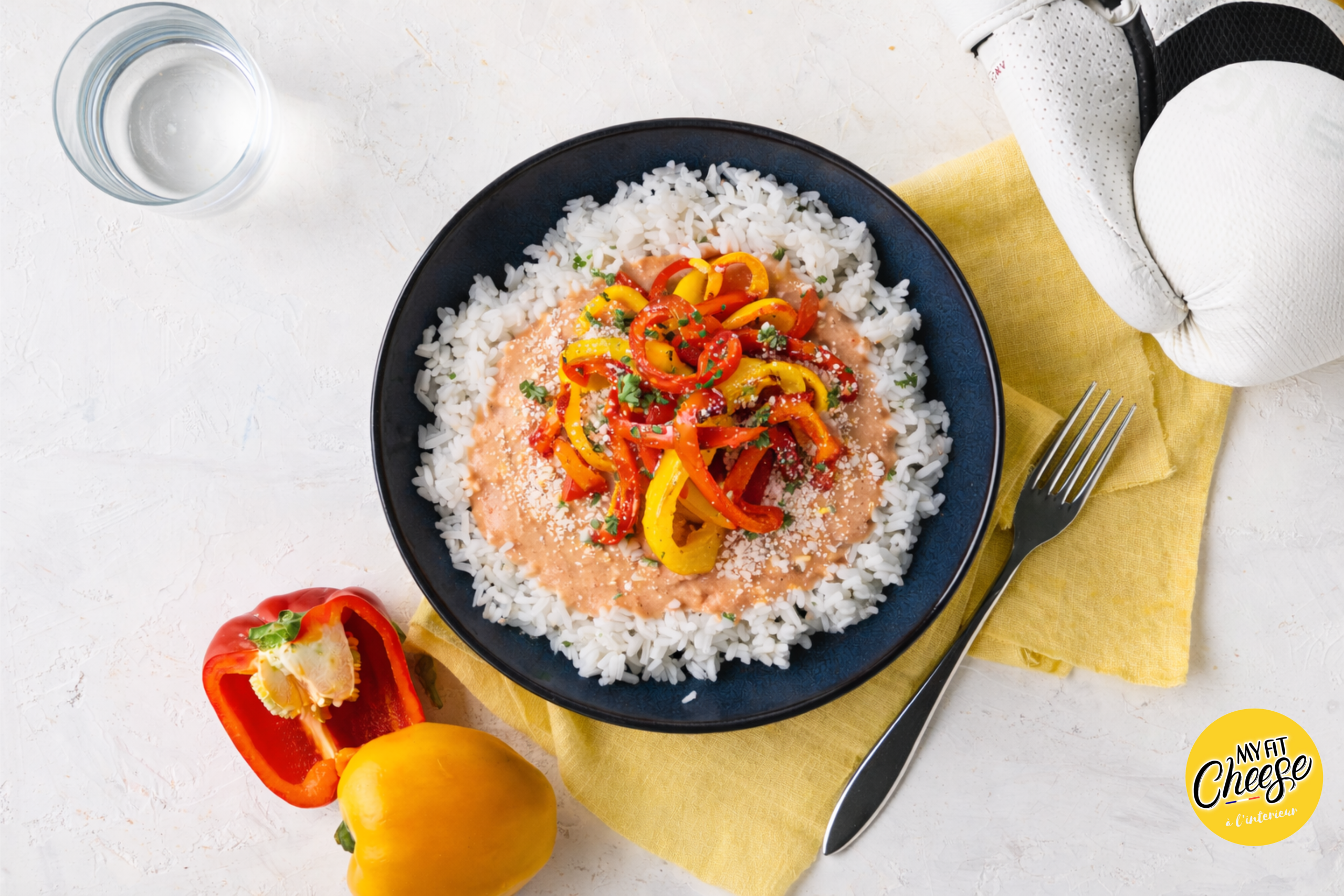 La version végé du repas préféré de Denis Gallois, le Creamy Chicken Tomatoes. Une sauce crémeuse à la tomate, accompagné de riz basmati et de poivrons poêlés, dans un concentré de protéines sans matière grasse avec le Parmefit de MyFitCheese®. Onctueux, crémeux et cheesy sans culpabilité !