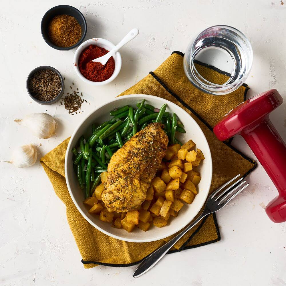Pour un repas riche en énergie, essayez nos patates douces rôties accompagnées de son poulet français juteux et de ses brocolis croquants, le tout assaisonné avec du curry, du cumin et du paprika fumé. Ce plat vous offre un mélange idéal de saveurs et de nutriments pour soutenir vos performances sportives.